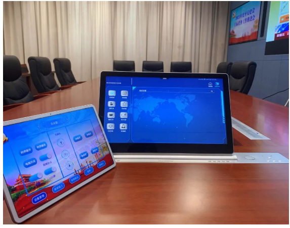 在12人的會議圓桌這里,安裝了12套WZH-L2LM 15.6"嵌入升降式無紙化終端,帶有電子桌牌和升降鵝頸發言話筒。它們具有銘牌顯示、文件批注、同屏廣播、分組廣播、異步瀏覽、跟蹤主講、外接信號顯示、臨時文件、主席控制等多種強大的功能;支持一鍵切換到Windows桌面,將Windows或其他軟件的操作界面同屏顯示到其它無紙化終端和大屏幕。