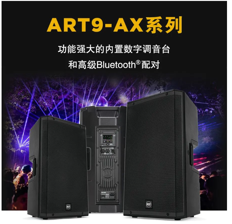 RCF最新推出了全新的ART9-AX系列,ART9-AX是一款具有48V麥克風前置放大器和線路輸入、內置6通道數字調音臺和高級DSP、Bluetooth®(藍牙)流媒體和控制功能的兩分頻揚聲器。適用于任何音頻應用的頂級解決方案。