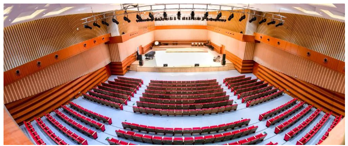 “琴島”音樂廳建筑面積2100平方米,內部結構呈扇形狀,扇形音樂廳的天頂呈等勢的遞進,目的是令聲學能量均勻擴散。在這種音樂廳中,聲樂的直接信號更容易送達。